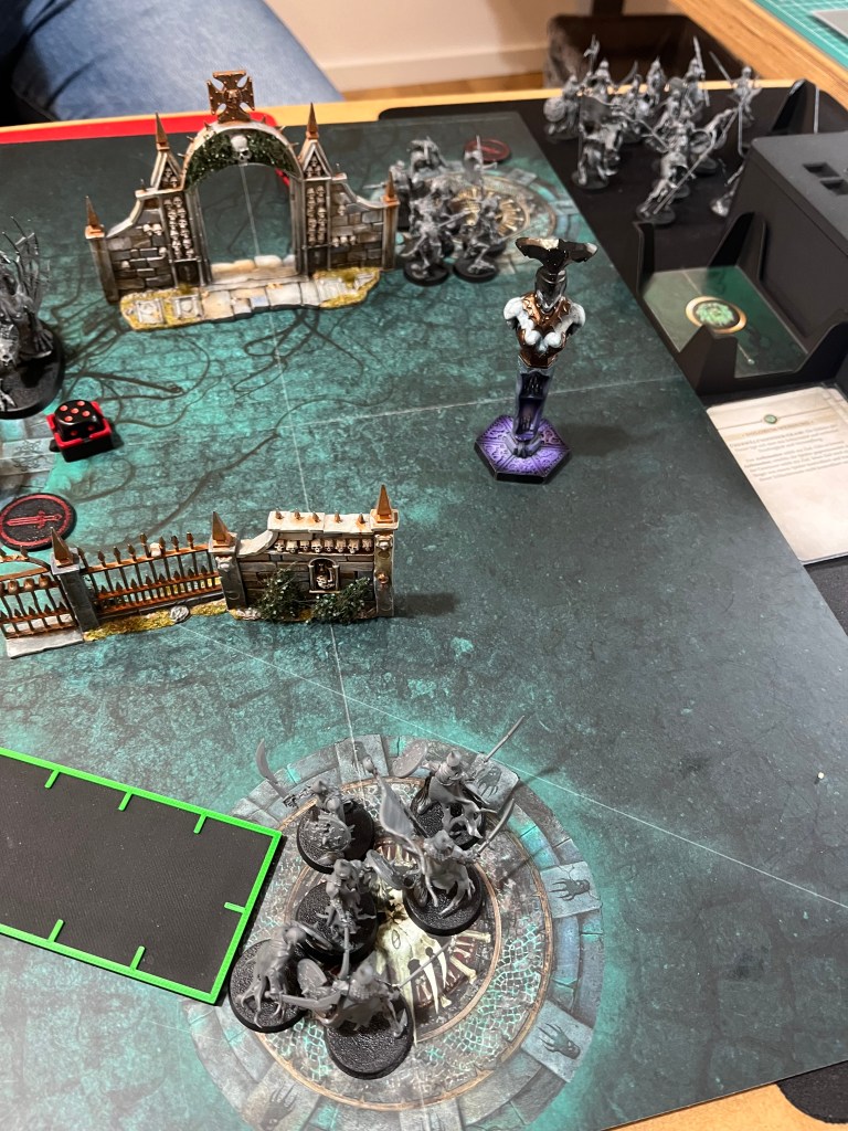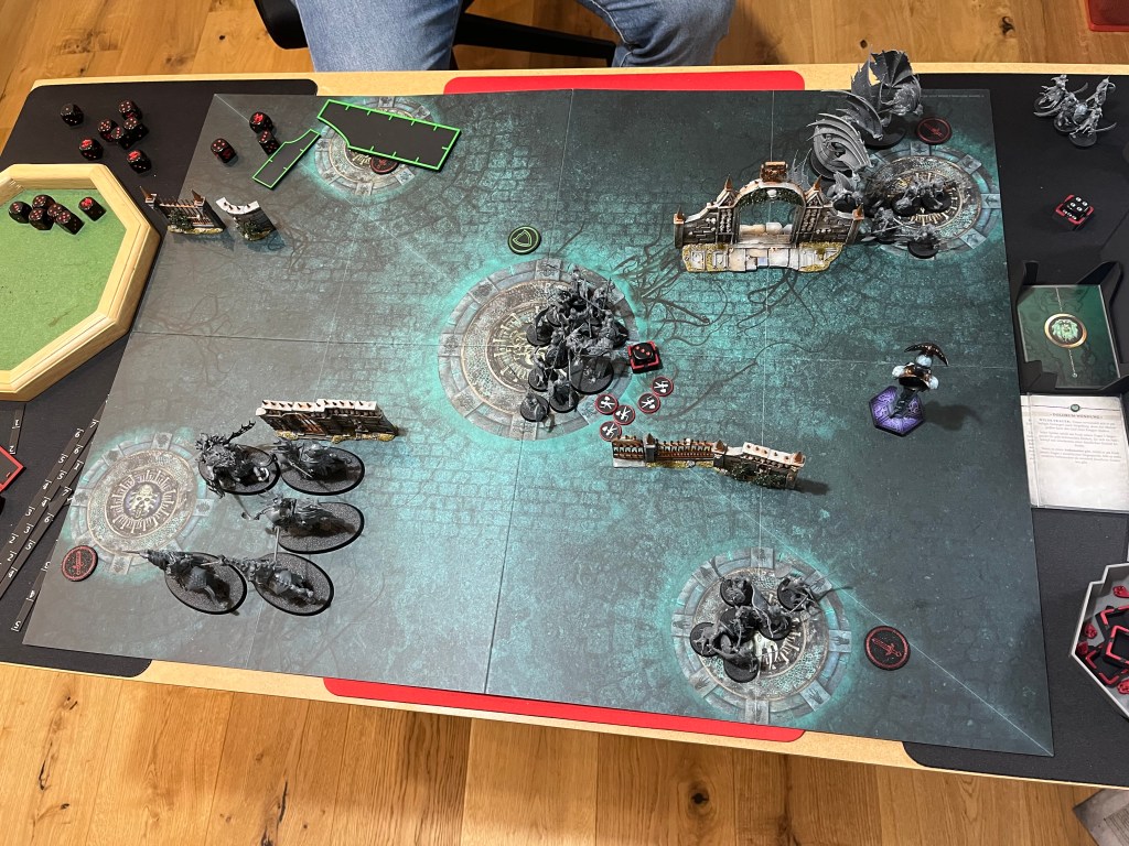 In Eazy’s turn, the >>Blood Knights<< happened. They charged straight down the middle and annihilated my poor Varghulf Courtier. Poor bastard… Fortunately, Eazy was also unable to score any objective cards and managed to hold only two objectives.